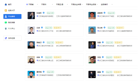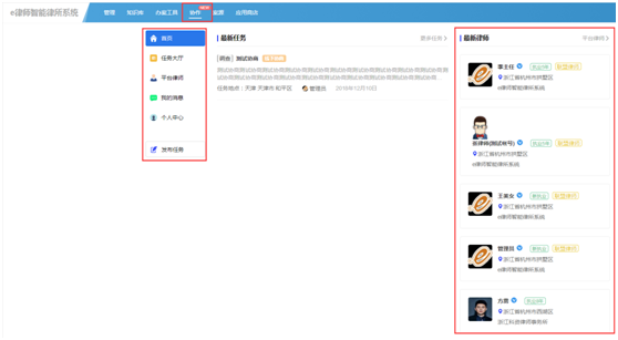 進入“e律師”律所管理系統之后點擊上方菜單按鈕:「協作」進入協作頁面,左側菜單分別包含了:首頁,任務大廳,平臺律師,我的消息,個人中心,發布任務。