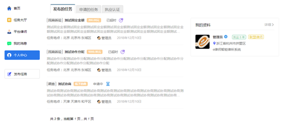 顯示當前登陸用戶的個人信息,發布的任務,申請的任務,執業認證信息。